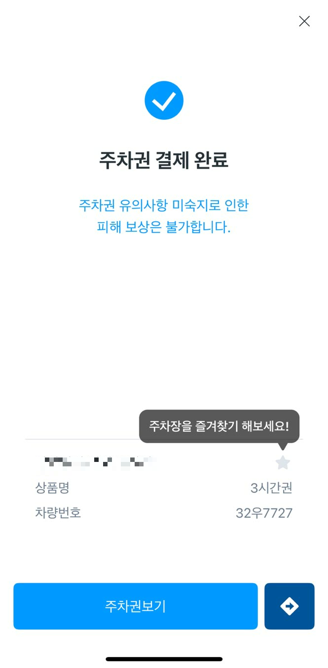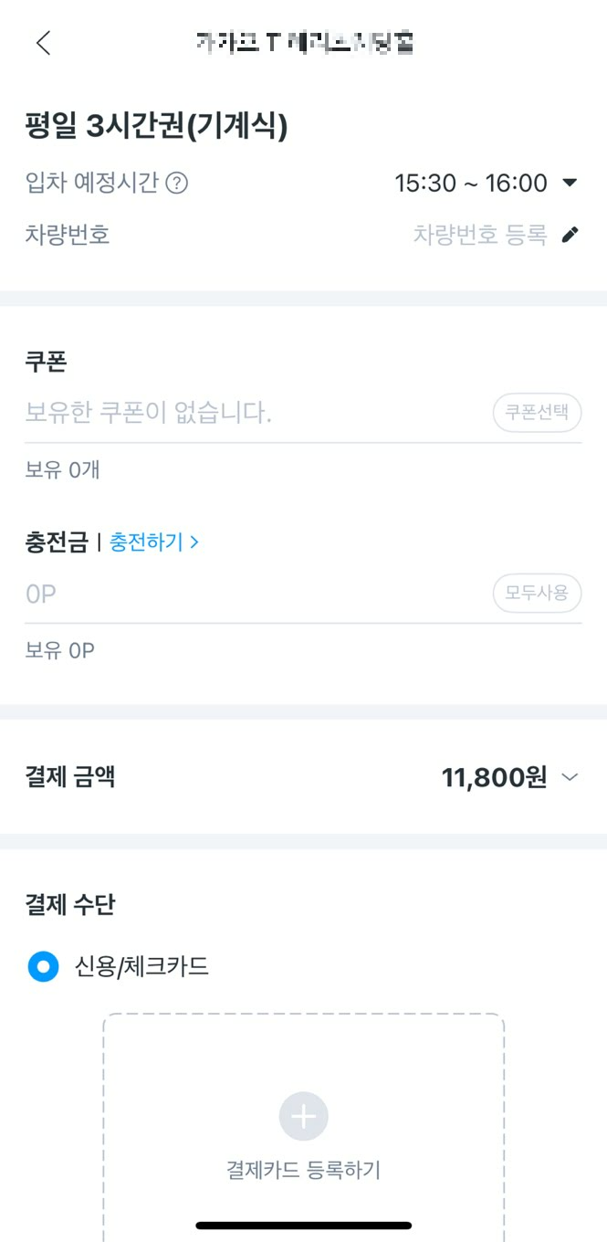 - 쿠폰 등 할인 정보 입력, 차량 번호 입력 후 결제 수단을 등록해 결제 하실 수 있습니다.