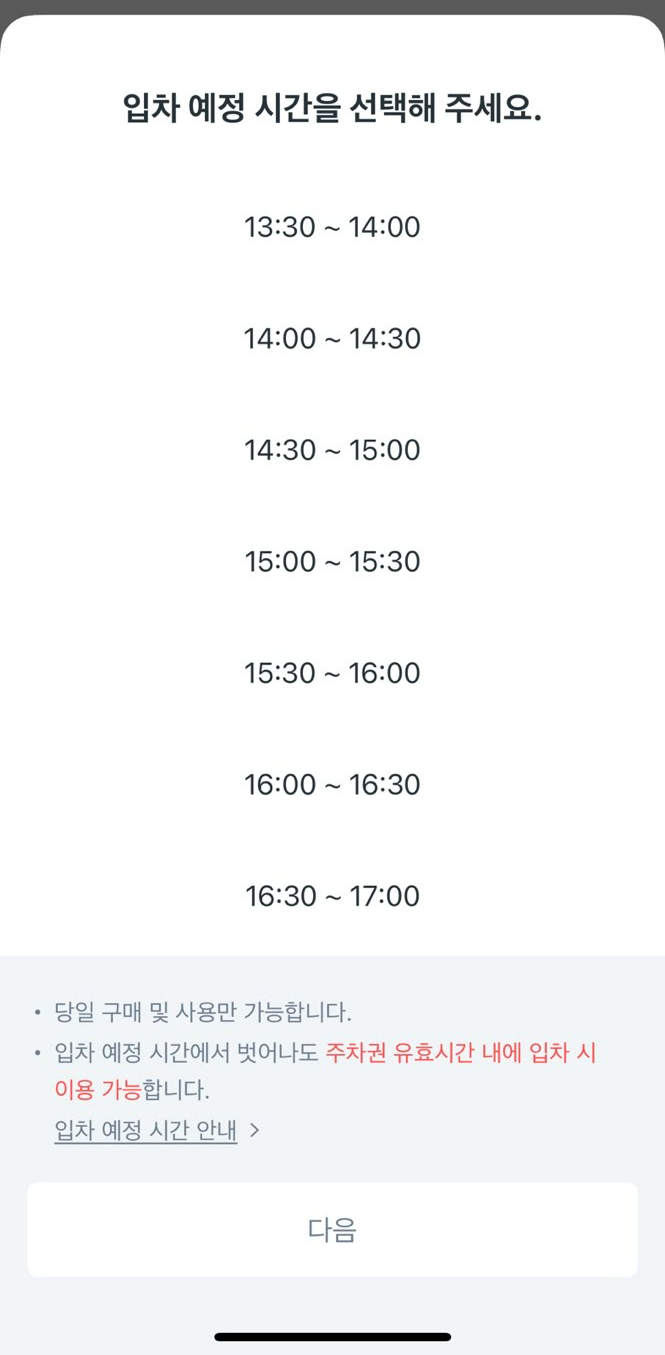 - 주차장 이용 예상 시간을 선택해 이용하실 수 있습니다.