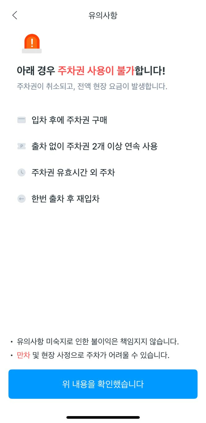 - 이용하실 주차장을 선택하시면 주차장 이용 시의 안내사항을 확인하실 수 있습니다.