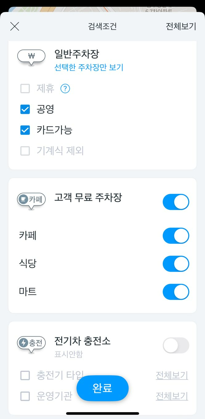 - 검색시에는 앱 내 다양한 필터를 통해 찾고자 하는 주차장을 찾을 수 있습니다.