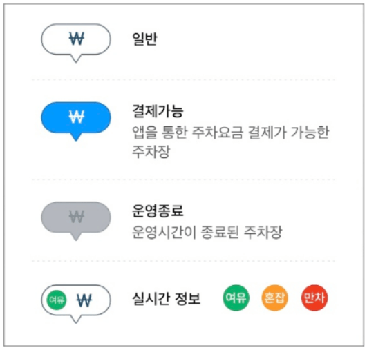 모두의 주차장 앱에서는 주차장 종류별로 다른 핀 모양으로 쉽게 정보를 확인 할 수 있습니다.